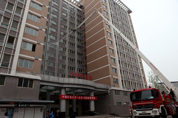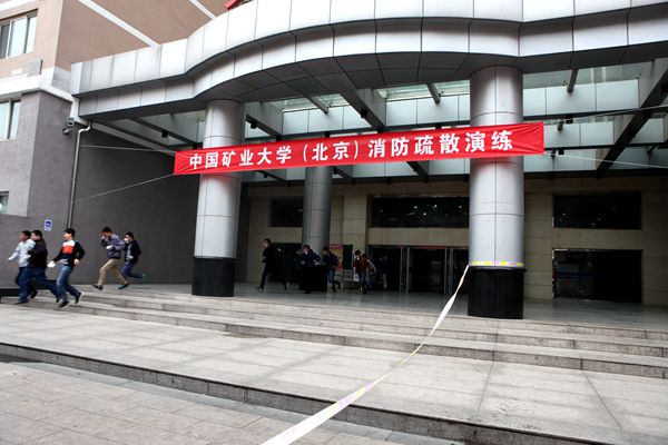 此次疏散演练假定学十楼1049房间发生火灾,现场烟感报警器报警,学十楼消防分控室接警,保卫处工作人员迅速前往1049房间确认火情,并向保卫处、后勤处学生公寓办公室报警,相关工作人员同时拨打119报警,学校立即启动消防应急预案,展开灭火自救。同学们在引导员的指挥下,拿湿毛巾掩住口鼻迅速从安全通道撤离,现场紧张而又有序。消防车被引导至学十楼前,消防员迅速投入了救火工作,火势得到控制并最终扑灭,消防员还使用直臂云梯救下了因受伤被困房间内的一位同学。医疗组也极速赶至现场,对模拟受伤的同学进行了救治。整个演练现场秩序井然。